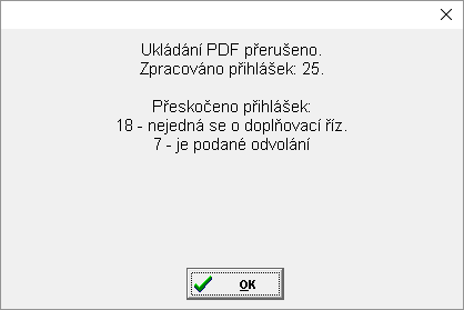 Po skončení tisku rozhodnutí, pokud některé přihlášky z uživatelského filtru byly ignorovány a neodešly k tisku, se zobrazí hláška o počtech těchto ignorovaných přihlášek a důvodech, proč byly ignorovány