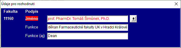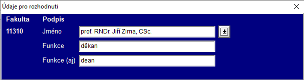 1. Přednastavuje se podle položky "Děkan (oident)"/"Proděkan (oident)" nastavené v číselníku Fakulta. Další údaje (jméno, funkce čj, funkce aj) se načítají ze seznamu Seznam funkcionářů VŠ.