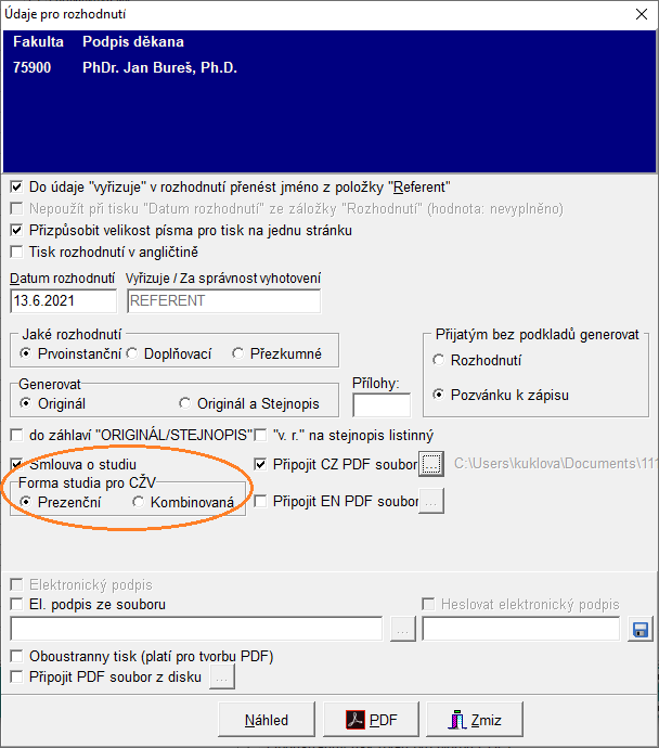 - při prvním generování rozhodnutí se do položek "Jméno", "Funkce", "Funkce (aj)" přednastavují hodnoty vyplněné v Parametrech v číselníku Fakulta