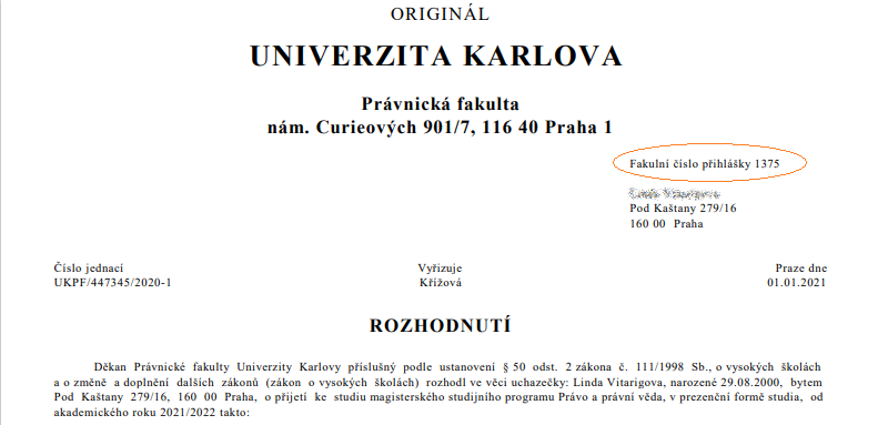 V Rozhodnutí o přijetí a Pozvánce k zápisu (Vyrozumění o výsledku přijímacího řízení) pro druhy studia CŽV se přesunulo místo tisku čísla jednacího. Nyní se tiskne nad korespondenční adresu uchazeče.