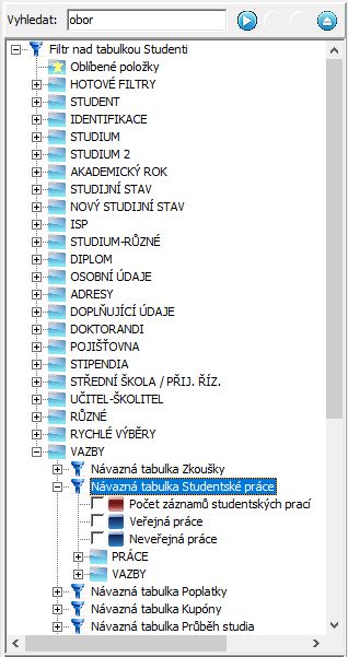 IS STUDIUM » Základní ovládání programu » Výběry a třídění » VAZBY - filtrování přes více tabulek