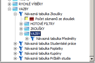 - Nastavení v návazných tabulkách nijak neovlivňuje nastavení v hlavních tabulkách (můžete mít nezávisle nastavený filtr na zkoušky a Studenti s vazbou na zkoušky).