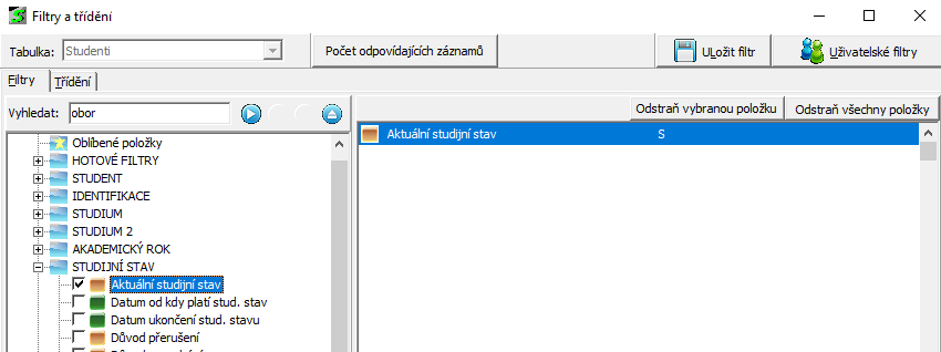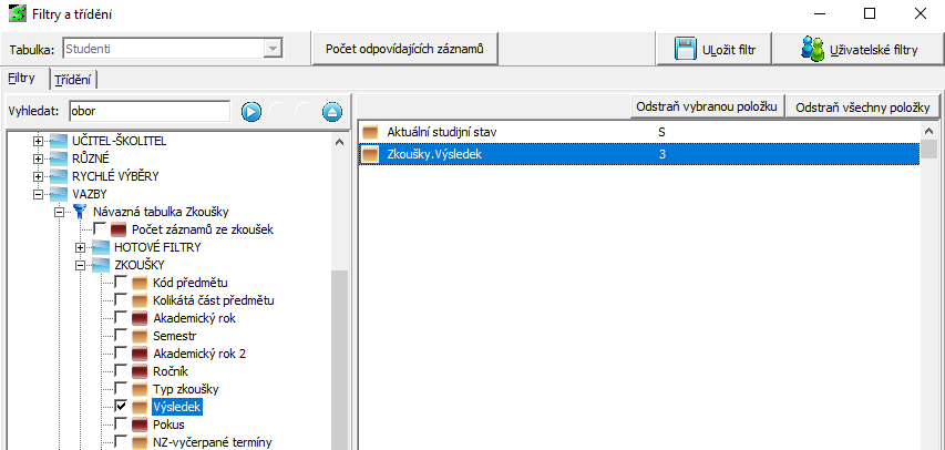 Jako příklad uvedeme následující situaci: Chci vybrat studenty s aktuálním studijním stavem „Studující“, kteří mají z jakékoliv zkoušky aspoň jednu trojku. Vyberu tedy položku „Aktuální studijní stav“ a přiřadím ji hodnotu „S“