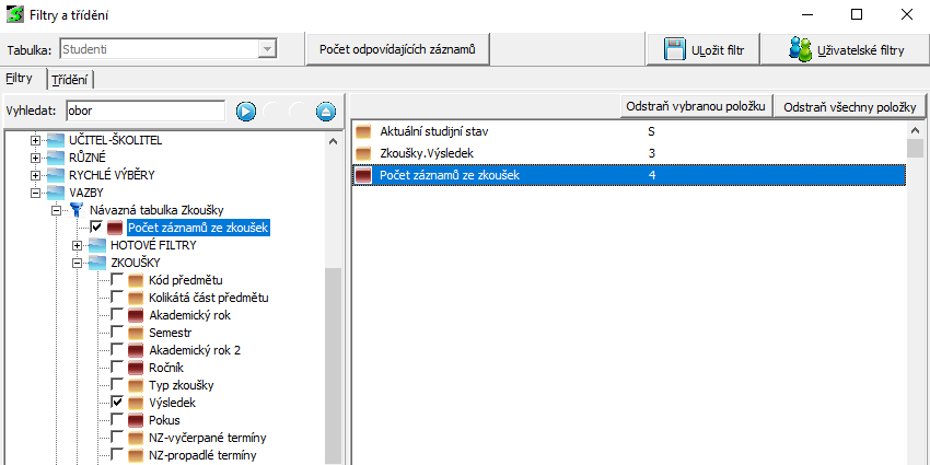 Např.: Budeme-li chtít v našem příkladě vybrat studenty, kteří mají právě 4 trojky, vyplníme položku „Počet záznamů ze zkoušek“ na rovnu 4.