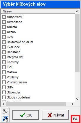 tlačítko Čís. - Otevře okno klíč. slov s možností editace fakultního číselníku. Po vytvoření nového slova se seznam pro výběr kl. slov (tlačítko se šipkou) aktualizuje.