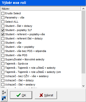 - Při následném výběru rolí ('tlačítkem se šipkou') a uložením dotazu, se všechny 'nevhodné' role smažou. (= při výběru rolí i uložení dotazu musí být stisknuto tlačítko OK).