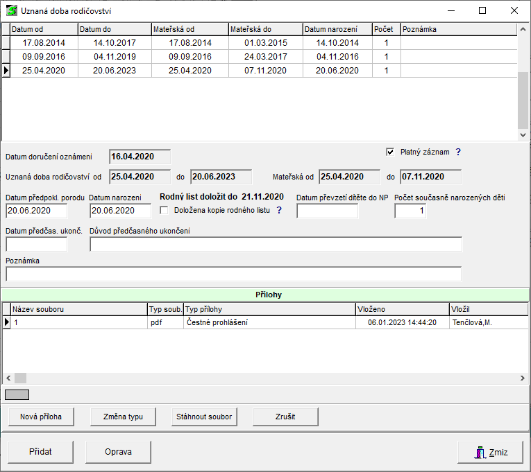 V evidenci uznané doby rodičovství lze evidovat také přílohy.