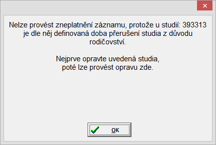 - Dojde-li v evidenci uznané doby rodičovství (dále "UDR") u existujícího záznamu ke změně data "od" / "do" nebo k zneplatnění záznamu, proběhne při ukládání (po stisku tlačítka "OK") kontrola, zda existují studia, která mají přerušeno nebo ISP z důvodu rodičovství a spadají do období právě tohoto opravovaného záznamu. Pokud ano, a změna UDR by způsobila kolizi dat, program toto oznámí s uvedením studií, kterých se to týká a nedovolí záznam uložit. V tomto případě je třeba nejprve opravit data v dotčených studiích a teprve pak je možno opravit záznam UDR.