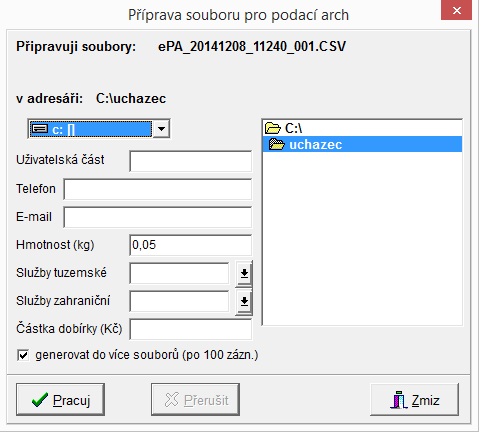 - generovat do více souborů (po 100 zázn.) - je-li položka nastavena, podací arch se při více záznamech generuje do více souborů (max. 100 adres + hlavička) - jako doposud. Není-li nastavena, podací arch se celý vygeneruje pouze do jednoho souboru. Výchozí nastavení: zaškrtnuto.