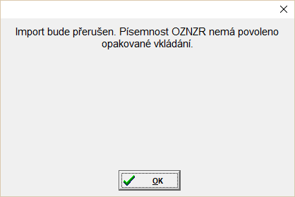 - Při pokusu o nahráni souboru do DB program prověří podle pole TPISEMNOSTI.MULTIKOD, jestli se daný typ písemnosti už pro vybraného studenta v DB nenachází a jestli jej může opakovaně nahrát. Pokud již existuje a typ písemnosti se nesmí nahrávat opakovaně, program na to upozorní hláškou.