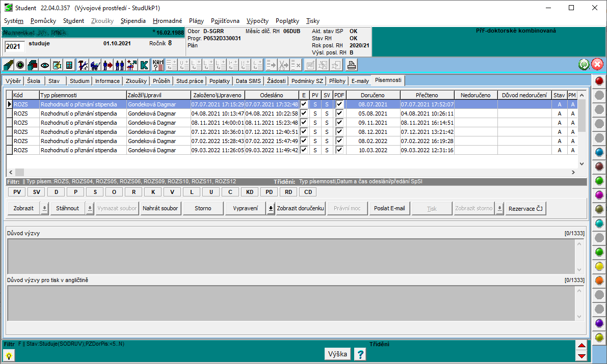 Zobrazují se zde i písemnosti odeslané studentovi v průběhu přijímacího řízení z programu Uchazeč. Tyto písemnosti je možno jen prohlížet.
