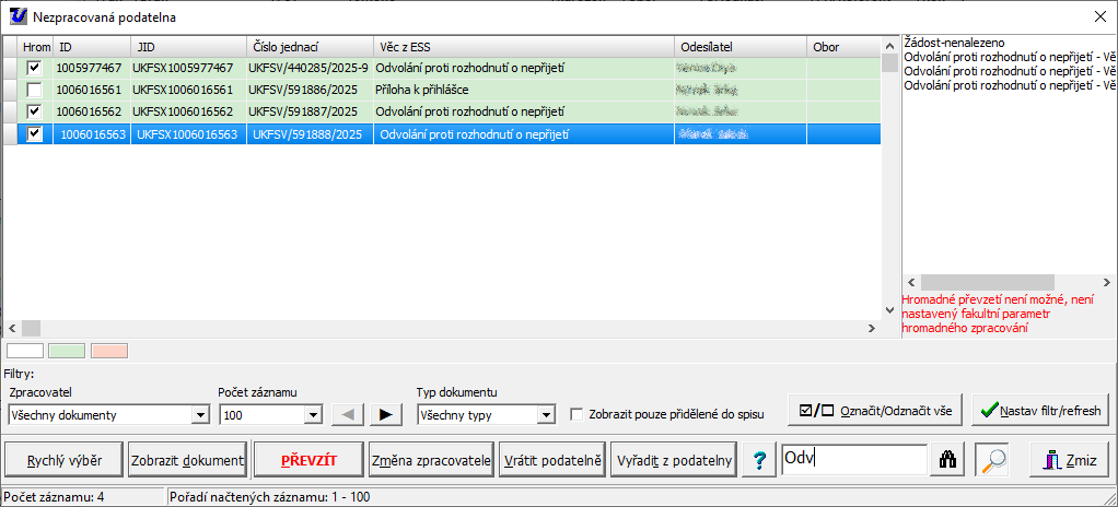 Hromadné akce (Změna zpracovatele a Vrácení Podatelně) lze během provádění přerušit pomocí tlačítka