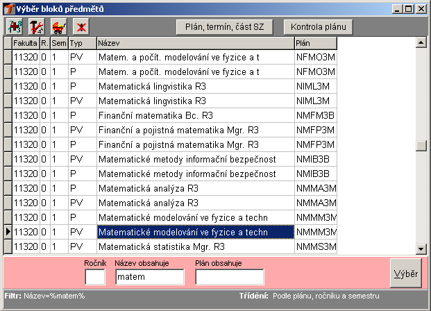 - Pokud není nastaven žádný filtr a stiskne se tlačítko Výběr, zobrazí se automaticky části SZ pouze pro plány, začínající prefixem, který odpovídá fakultě uživatele.