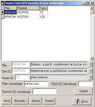 - Plán, termín, část SZ - umožňuje definovat SZ pro daný plán. Je potřeba definovat všechny SZ, které patří do plánu. Skládá-li student SZ postupně v průběhu studia, použijí se termíny SZA, SZB atd. Termíny SZA, SZB... neurčují pořadí, ve kterém se mají SZ skládat. Pořadí je dáno prerekvizitami apod. u předmětů státnic.