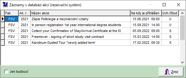 je možno zobrazit akce, na které je uchazeč přihlášen. Otevře se okno "Záznamy v databázi akcí (rezervační systém)".