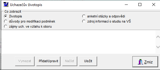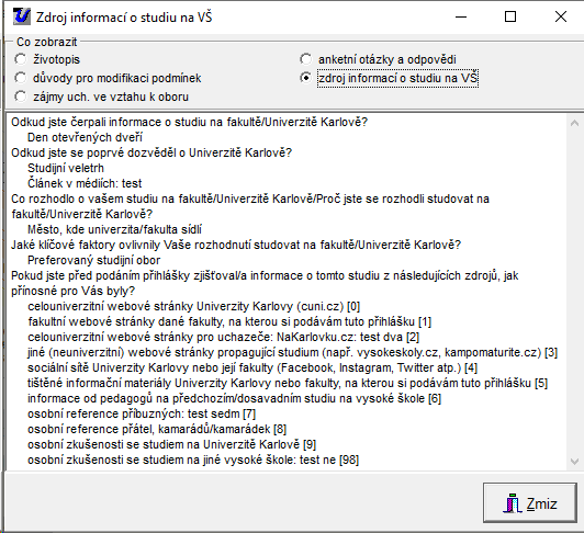 - zobrazuje životopis, důvody pro zvláštní zacházení, zájmy uchazeče ve vztahu k oboru, anketní otázky a odpovědi, zdroj informací o studiu na VŠ - tak, jak byly údaje vyplněny uchazečem do webové přihlášky.