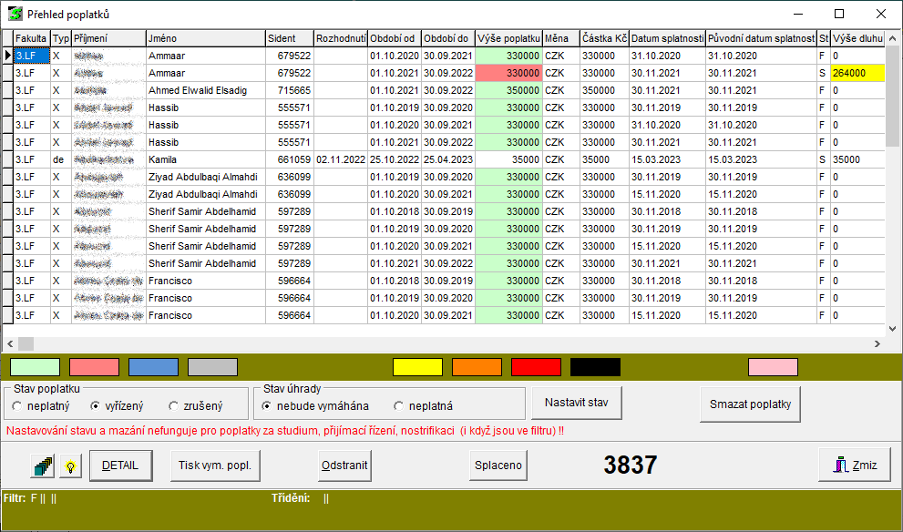 - světle růžová – odepsaná pohledávka (poplatky.odpis = 'A')