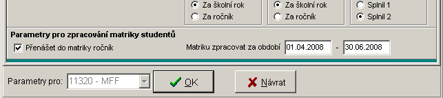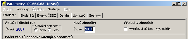 Záložky v okně Parametry obsahují aktuální nastavení jednotlivých parametrů systému STUDIUM.