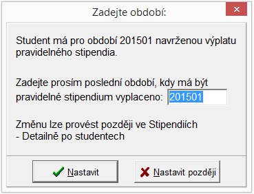 Při změně aktuálního nebo nového studijního stavu na Absolvoval, Zanechal nebo Přerušil se po ukončení editace tlačítkem OK zobrazí upozornění na případná pravidelná stipendia s nabídkou jejich zrušení - zadáním období, kdy má být stipendium naposledy vyplaceno.