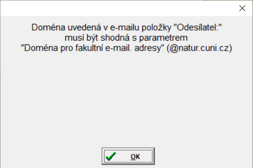 Nelze zadat e-mailovou adresu odesílatele z jiné domény, než udává fakultní parametr "Doména pro fakultní e-mail. adresy" (pokud je parametr vyplněn), který se nastavuje také v programu Parametry, záložka OSTATNÍ.
