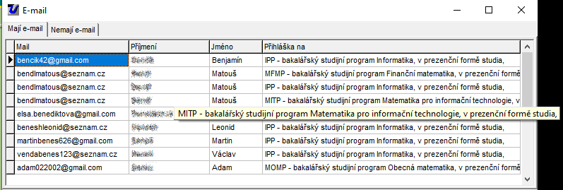 - v seznamu vyfiltrovaných uchazečů (záložka "Mají e-mail", "Nemají e-mail") se objeví více záznamů - za každou přihlášku z filtru jeden záznam;