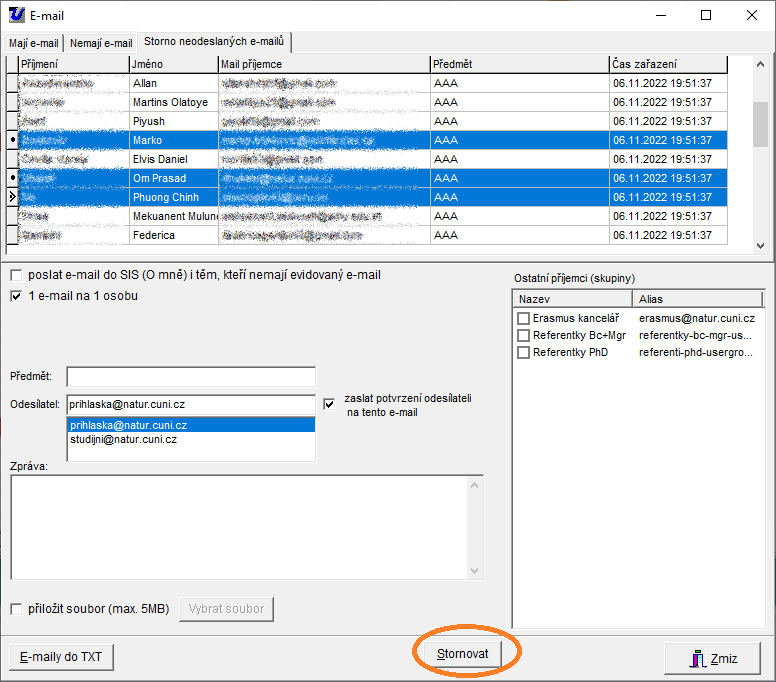 Po tuto dobu se maily k odeslání zobrazují zde na záložce, lze je označit a stornovat tlačítkem "Storno".