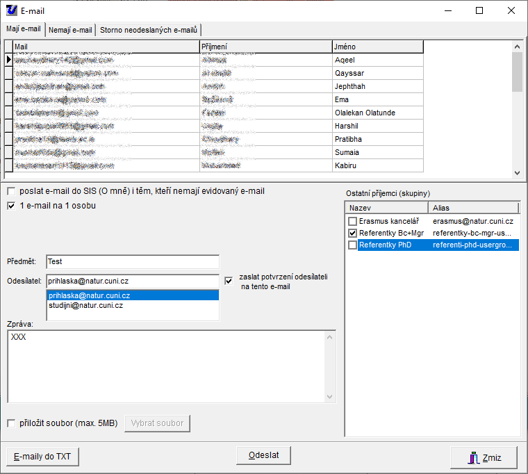 - Daný e-mail se pošle jak studentům tak také vybraných skupinám ze seznamu "Ostatní příjemci (skupiny)".