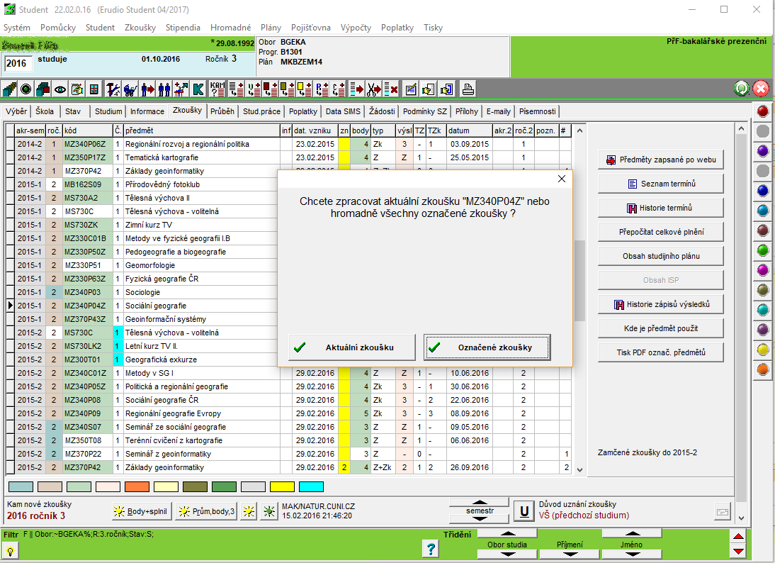 - se má zpracovat aktuální záznam (na kterém je nastaven kurzor): provede se uznání aktuální zkoušky
