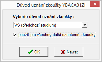 - nebo se mají hromadně zpracovat všechny označené zkoušky: provede se hromadné uznání všech označených zkoušek. Všechny označené zkoušky musí být pouze splněné nebo pouze uznané, jinak program uznání neprovede. Při výběru důvodu uznání lze zaškrtnout položku "použít pro všechny další označené zkoušky" a vybraný důvod uznání se pak použije na všechny následující zkoušky ve výběru. Pokud se položka nezaškrtne, půjde důvod uznání zadat u každé zkoušky zvlášť.