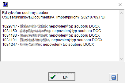 - při volbě "do jednoho PDF"/"do jednoho PDF (sudý počet stran)" se přidávají do PDF souboru jen přílohy typu PDF. Přílohy ostatních formátů se při stahování přeskočí. Uživatel o tom bude informován v závěrečném reportu