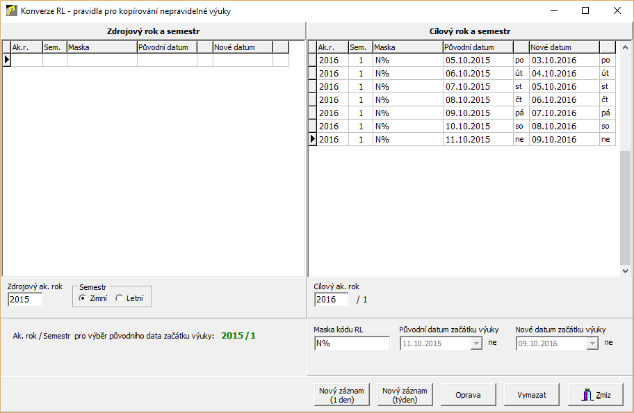 - Položky Maska kódu RL a zdrojové datum musí být pro daný ak. rok a semestr jedinečné.