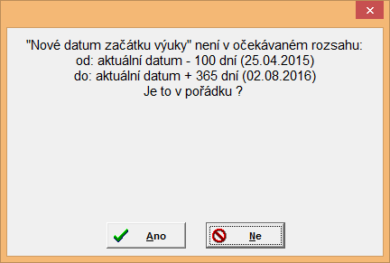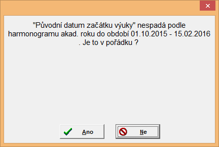 - Kontrola podle harmonogramu akademického roku, zda zadané zdrojové datum spadá do vybraného období akademického roku a semestru. Pokud datum nesouhlasí, program zobrazí varovnou hlášku, kde je také uvedeno období, do kterého má datum spadat. Pokud uživatel nastavená data odsouhlasí, data se uloží.