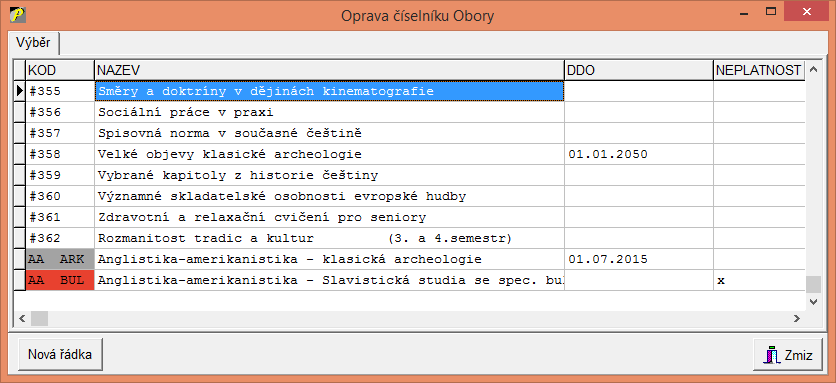 - Pokud se při výběru z číselníku vybere neplatná nebo expirovaná hodnota, program na to upozorní, ale hodnotu dovolí uložit.