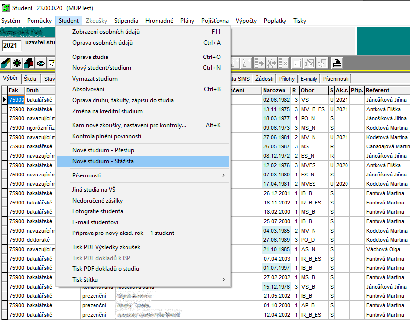 V menu Student, Nové studium - Stážista.