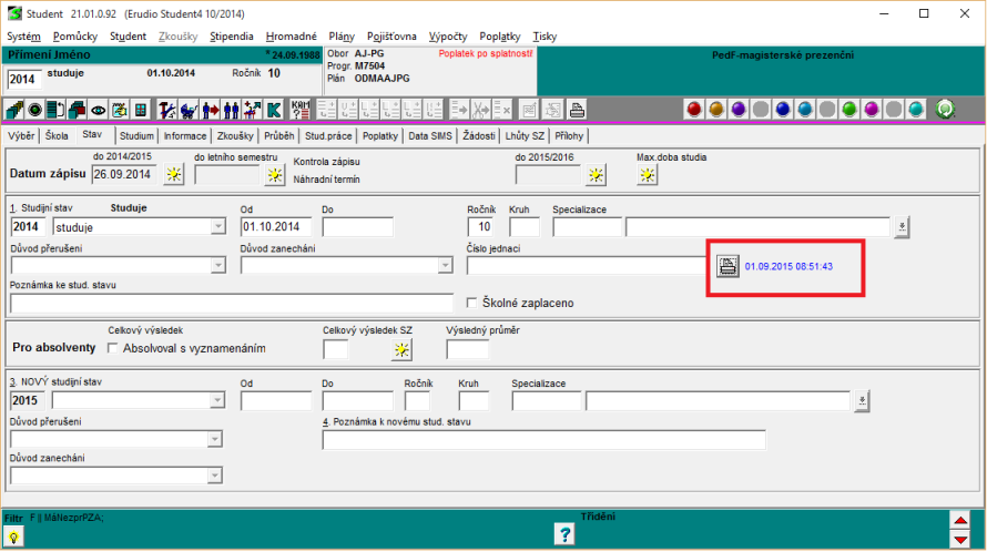 Na záložce Stav byl upraven tisk rozhodnutí (tlačítko s tiskárnou vedle položky Číslo jednací). Pro vybrané důvody přerušení a ukončení studia se tiskne Rozhodnutí o přerušení studia a Rozhodnutí o ukončení studia.