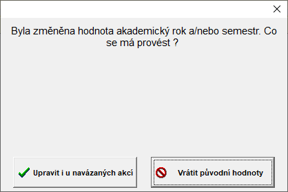 - změní-li se u matky akad. rok nebo semestr, program na to upozorní a nabídne buď provést změnu i u návazných akcí, nebo vrátit původní hodnoty, jako u položky katedra.