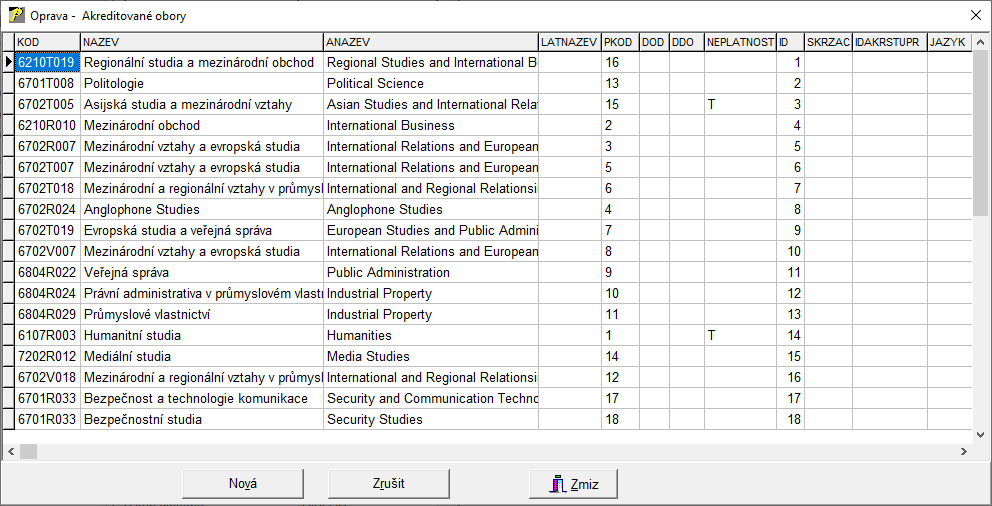 Parametry » Číselníky » Akreditační číselníky » Akreditované obory