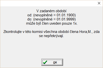- Stejná osoba může být u komise uvedena vícekrát, v různých funkcích, ale jednotlivá funkční období se nesmí překrývat. Pokud ano, program toto oznámí, doporučí zkontrolovat všechny období dané osoby pro danou komisi a nedovolí takový záznam uložit.