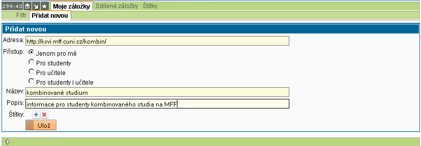 Přidání nové záložky, eventuálně editace stávající, se prování v podmenu Přidat novou eventuálně Uprav záložku.