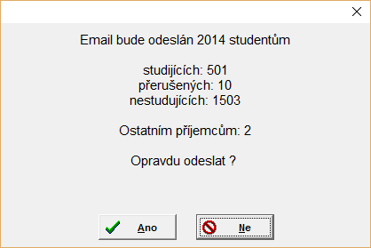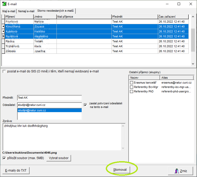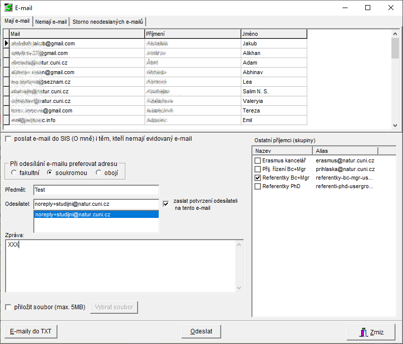 - Daný e-mail se pošle jak studentům tak také vybraných skupinám ze seznamu "Ostatní příjemci (skupiny)".