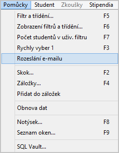 V programech Student a Uchazeč je možné rozeslat vyfiltrovaným studentům či uchazečům hromadně email (včetně přílohy). Rozesílací okno se otevře po vybrání položky menu Pomůcky - Rozeslání e-mailu. Bližší popis naleznete v kapitole  Uchazeč/Rozesílání emailu.