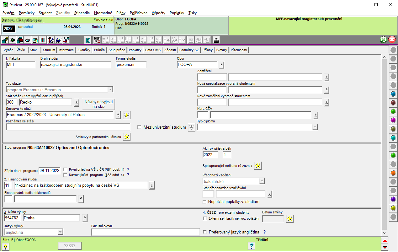 - Zaměření - detailnější členění jednotlivých fakultních oborů. Při výběru "Zaměření" nabízí pouze zaměření určené pro studijní obor daného studenta, s odpovídajícím nebo nevyplněným druhem studia (položka SPDRUH) v číselníku "Zaměření" (SPEC).