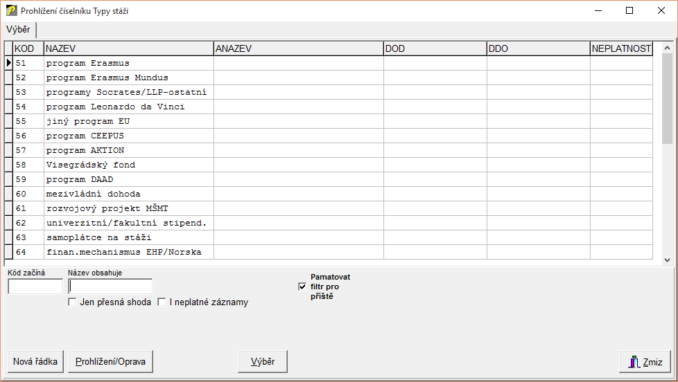 - Návrhy na výjezd na stáž - tlačítkem se otevře okno Seznam návrhů na výjezd na stáž. Podrobněji je popsáno zde.