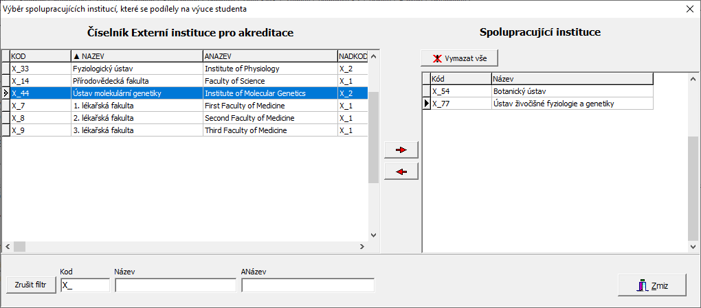 - Pomocí tlačítek-šipek vpravo/vlevo lze do pravé části okna s názvem "Spolupracující instituce" přidat/odebrat požadované instituce.