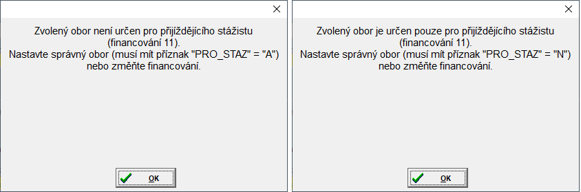 - je-li zapnut parametr "Používat vlastní obory pro stáže a DZS MŠMT (Parametry, záložka "Instalace"), kontroluje se při ukončení editace studia přes tlačítko "OK" u financování 11 správné použití oboru "pro stáže / DZS MŠMT". Zakládání oboru "pro stážisty" popisuje kapitola dokumentace Obory pro stáž