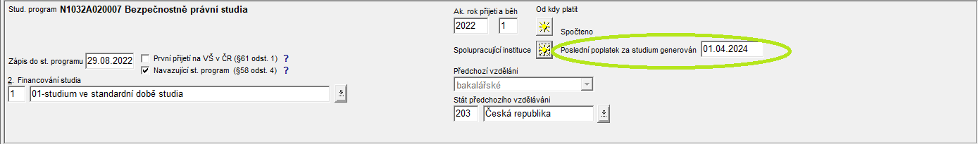 - Poslední poplatek za studium generován - pouze pro PA - datum, kdy byl naposledy studentovi vyměřen poplatek za studium