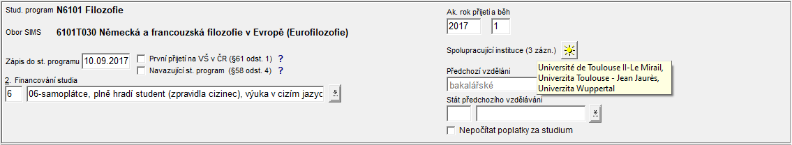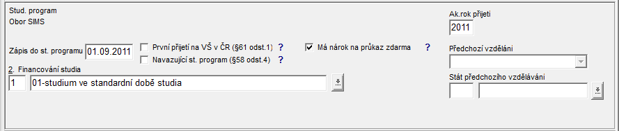 - Podle oboru studia se automaticky doplňuje údaj Studijní program a Obor SIMS (u oborů dle "staré" akreditace) nebo Specializace (u oborů dle "nové" akreditace, se specializací).