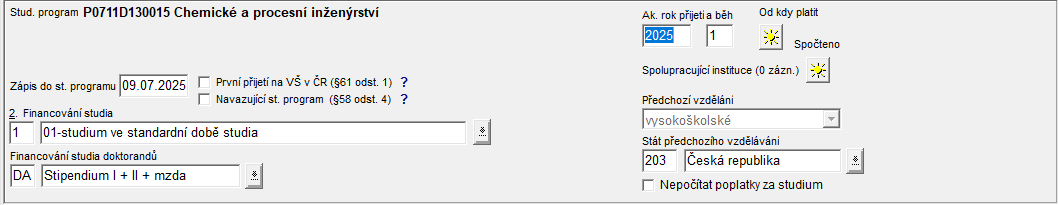 - Financování studia - vyplňuje se podle číselníku Financování studia. Položka je povinná pro matriční studenty (druh studia - bakalářské, magisterské, navazující magisterské nebo doktorské).