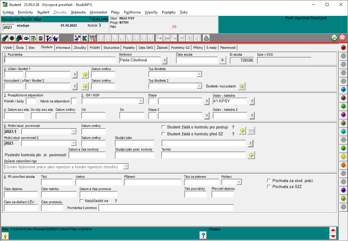 • Referent - označení referentky (referenta), k níž je student přidělen. Vyplňuje se podle číselníku.