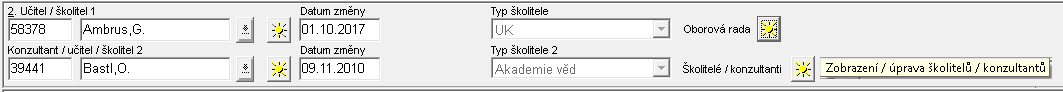 • Položky pro druhého učitele/školitele nebo konzultanta se vyplňují analogicky. Údaj o konzultantovi na rozdíl od školitele nemusí být vyplněný od data zápisu a taktéž nemusí být vyplněný v průběhu celého studia.